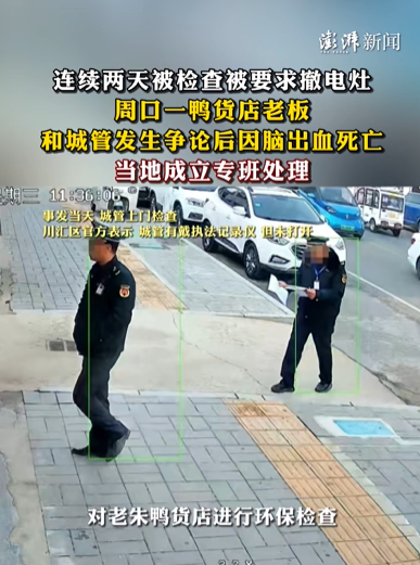 据澎湃新闻,2025年12月24日,河南周口市川汇区的城管执法人员上门对老朱鸭货店进行环保检查,要求其撤电灶,51岁的鸭货店老板与城管发生争论。城管离开后约5分钟,鸭货店老板晕倒,后送医抢救,最终因脑出血宣告不治。