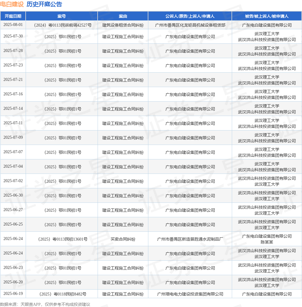 案号:(2025)鄂01民初1号审理法院:湖北省武汉市中级人民法院案由:建设工程施工合同纠纷当事人信息: 原告/上诉人:广东电白建设集团有限公司 被告/被上诉人:武汉洪山科技投资集团有限公司、武汉理工大学开庭日期:2025年5月14日根据统计,近一年内以广东电白建设集团有限公司为当事人的历史开庭公告有213则,其中案由为“建设工程施工合同纠纷”的公告以90则居首,其次为“劳务合同纠纷”有29则,“买卖合同纠纷”有19则。历史开庭公告(前20条)如下: